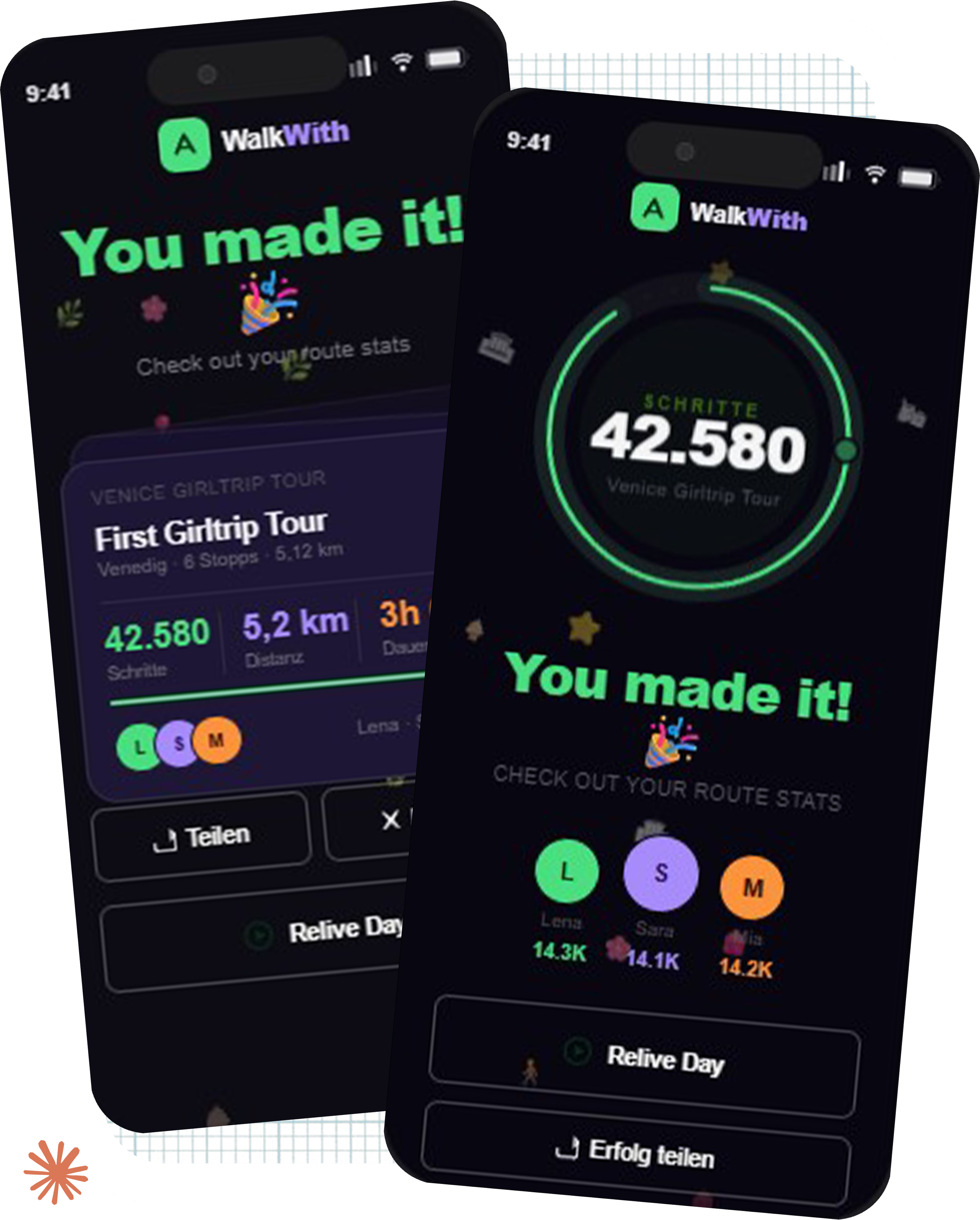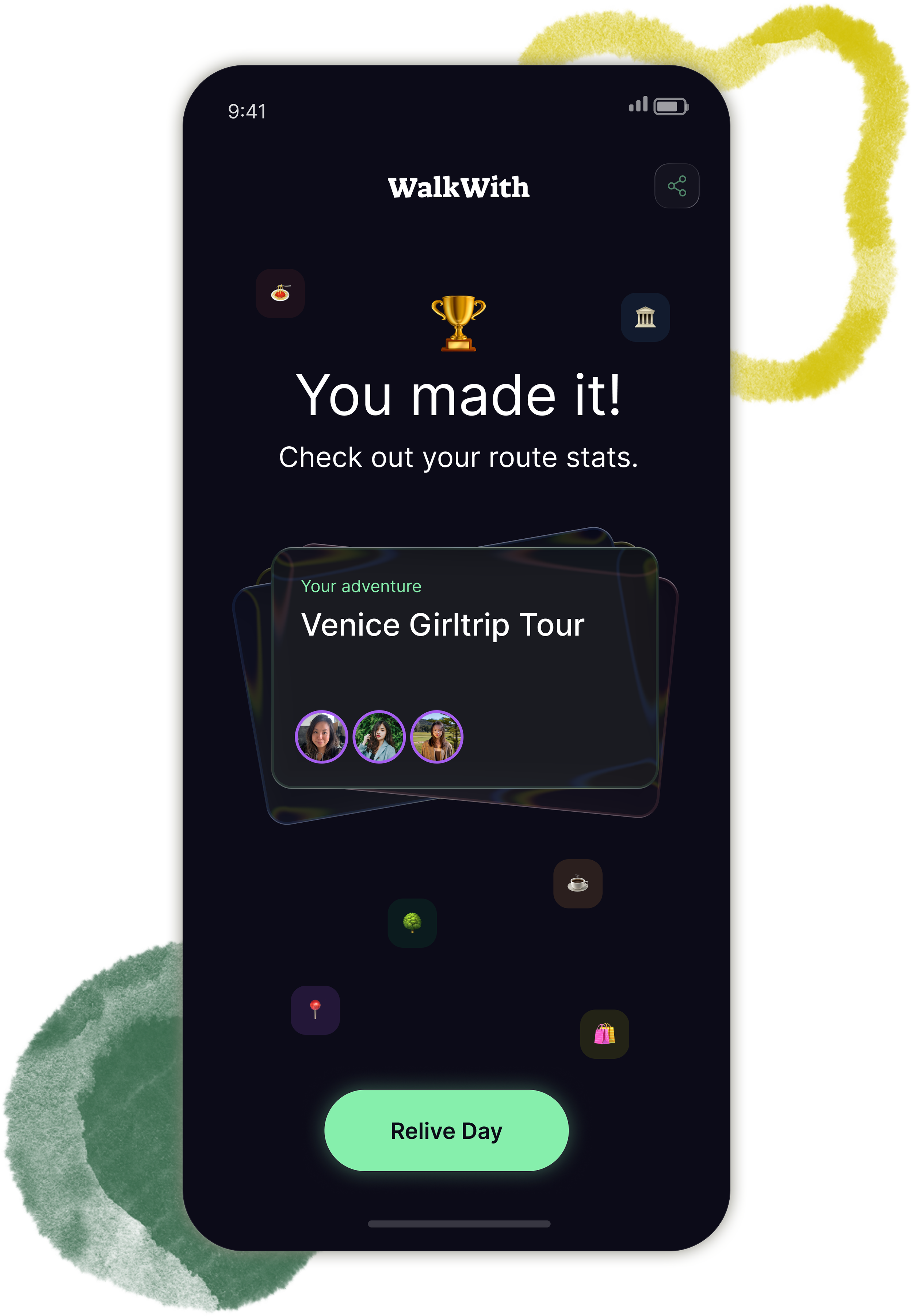 When GPS registers that the group has reached the final destination (back to Hotel), WalkWith prompts everyone to reveal their day. Nothing is shown upfront. The design creates the same pull as a Spotify Wrapped moment: You want to tap before you see what's inside.