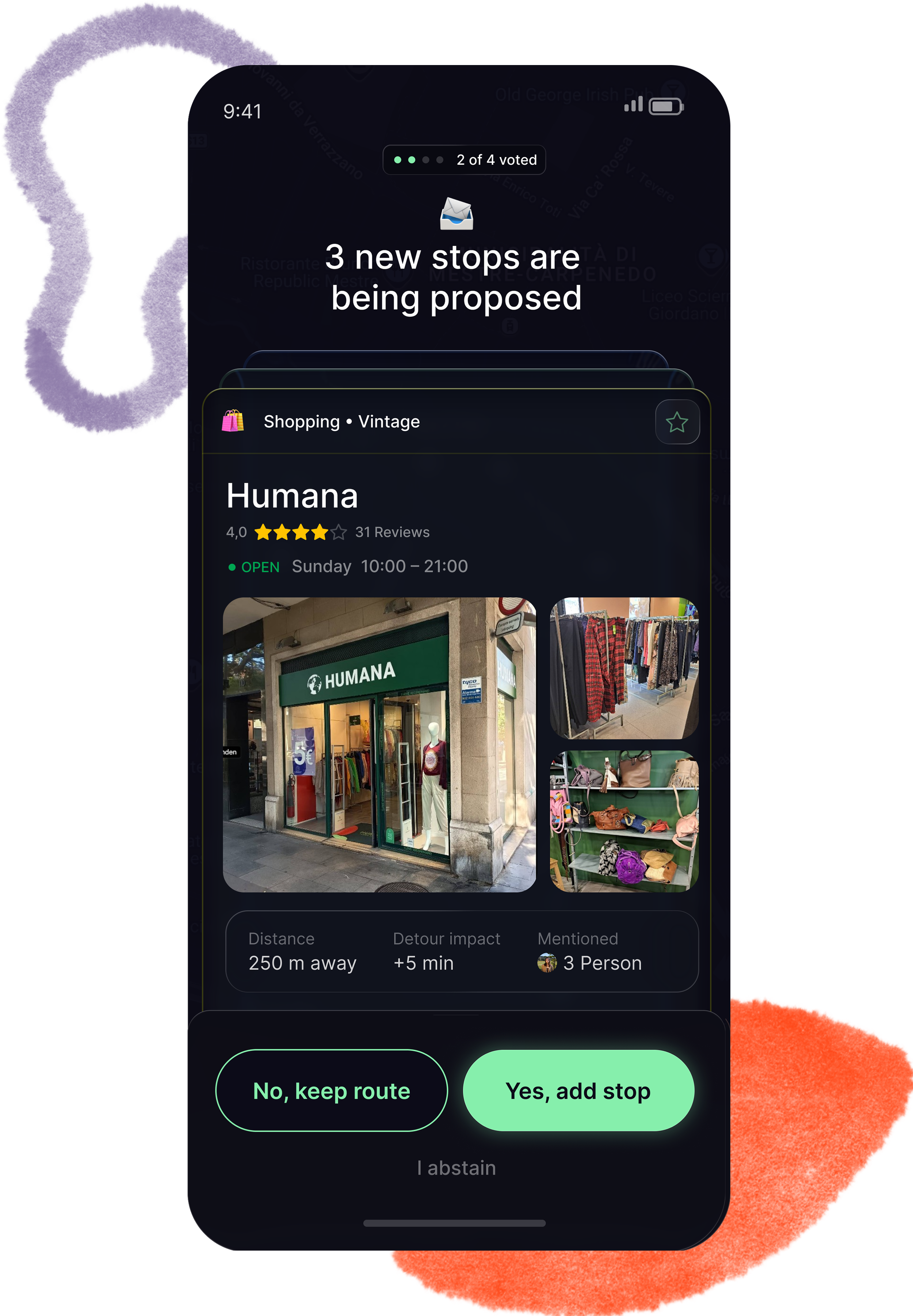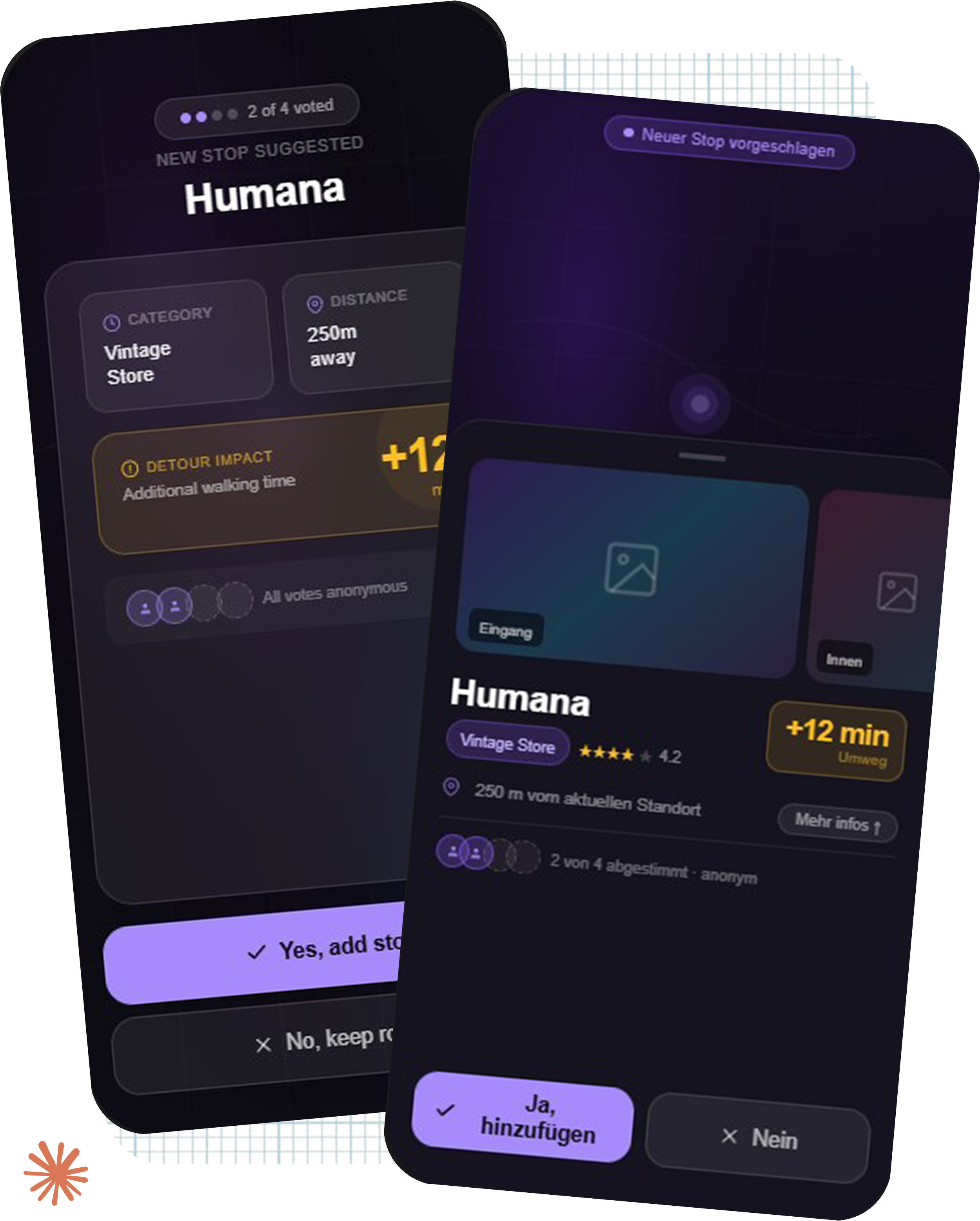 Anonymous Voting: When the group wants to change direction, proposals appear as swipeable cards without revealing who suggested them. The Tinder-style format came from a specific realization: In a large group, there are always at least two or three competing ideas at the same time. A single-card layout would hide that. The swipeable format makes the volume visible and the decision fast.