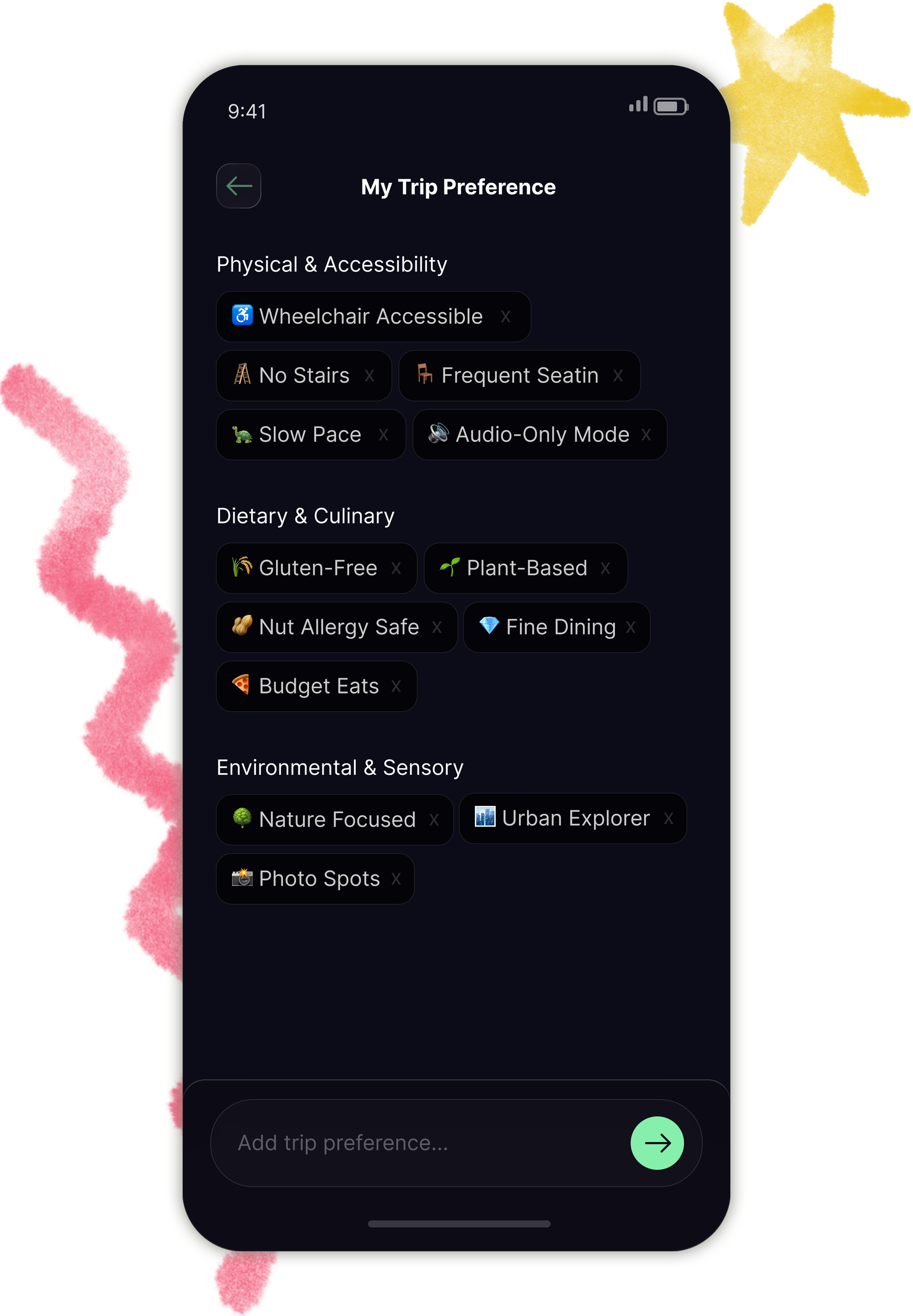 Rather than a flat preferences form, I built a tagging system that separates hard exclusions from soft interests.