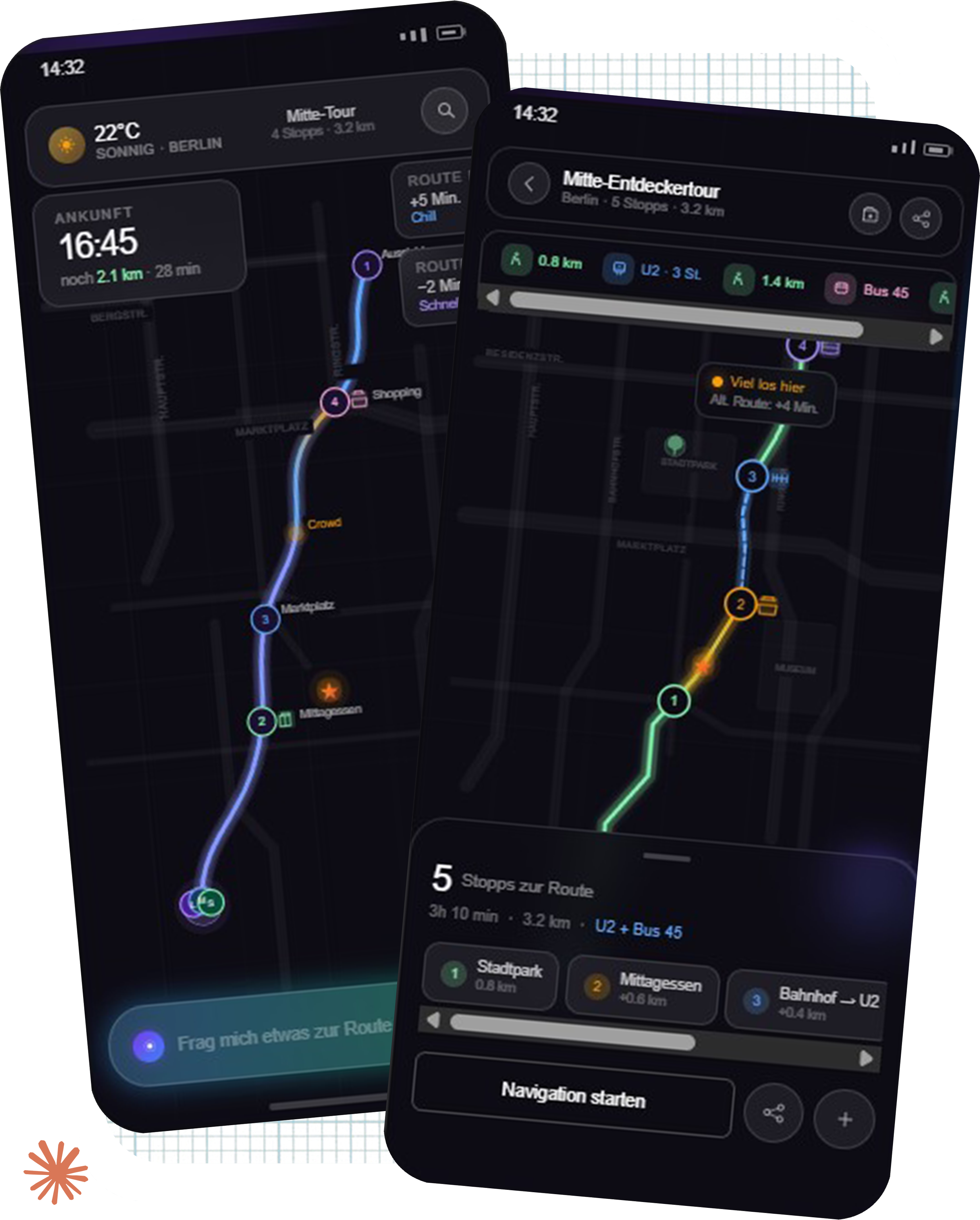 Transit-Pivot: The connections between stops are interactive. One tap switches between walking and public transit. Arrival times update for the entire group in the background, without restarting navigation. The route doesn't collapse. The group keeps moving.