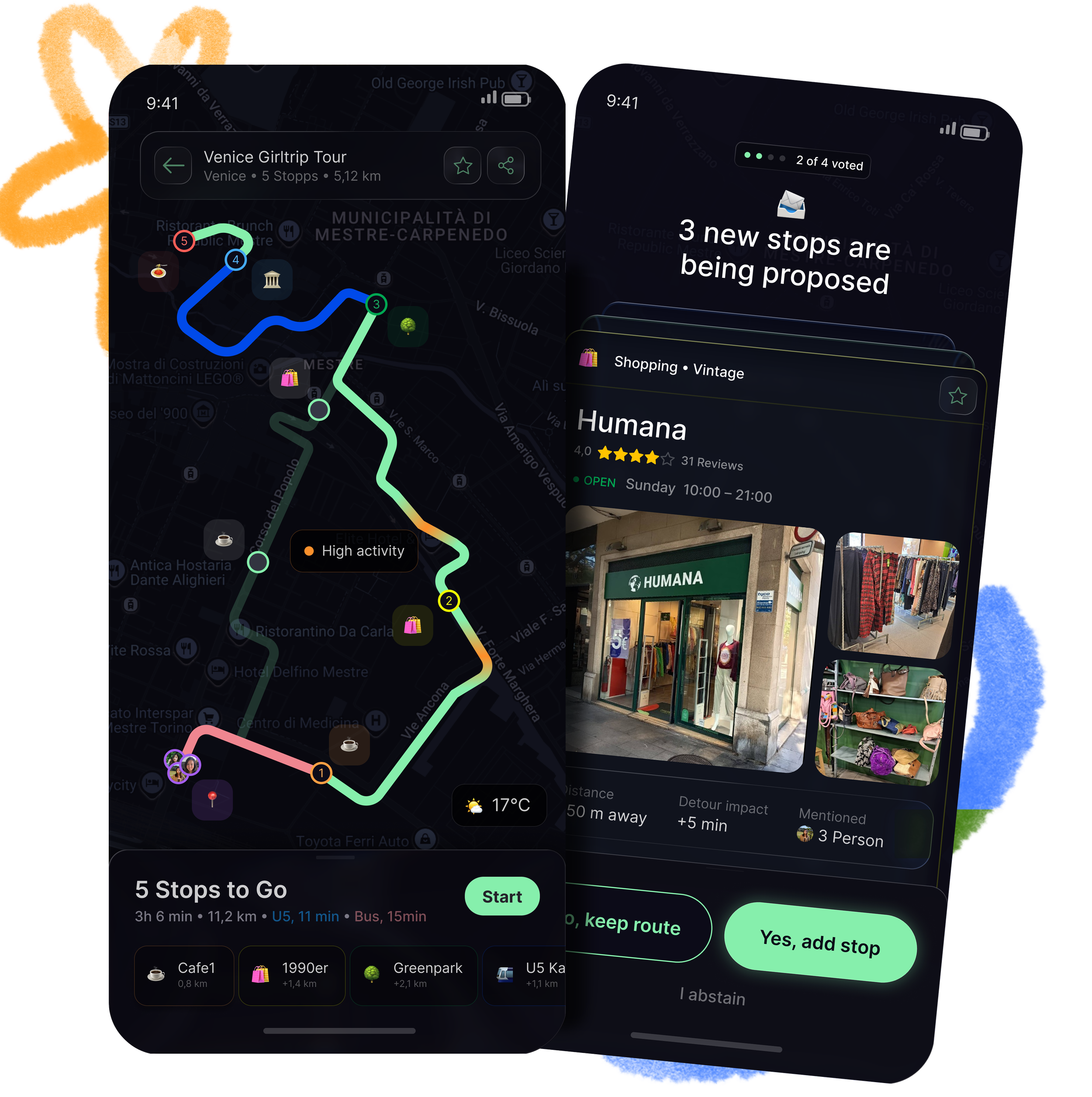 Both Admin and Co-Admin can modify the route and initiate votes. Other group members can submit location ideas but cannot change the route directly. Everyone can follow along passively.